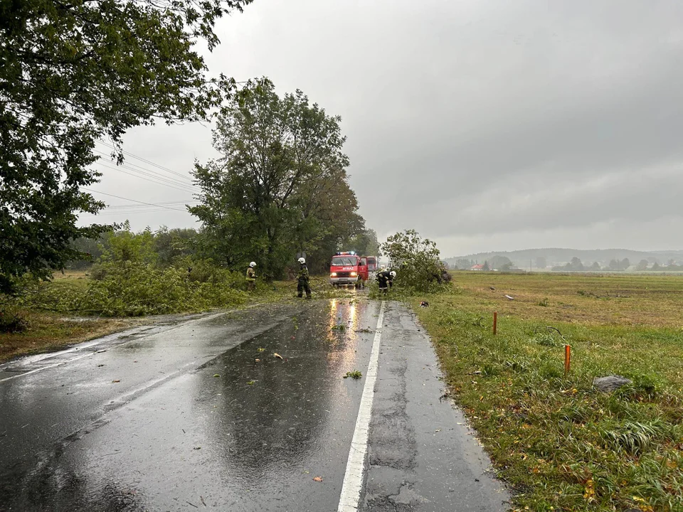 Utrudnienia są spowodowane usuwaniem skutków trąby powietrznej, która przeszła nad tym terenem. Na jezdni leży mnóstwo powalonych drzew i połamanych konarów. Przejazd jest zablokowany w obu kierunkach.