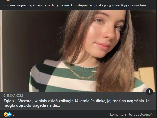 „Rodzina zaginionej dziewczynki liczy na nas. Udostępnij ten post i przyprowadź ją z powrotem”. Taki post pojawił się na grupie Moje Miasto Zgierz 28 sierpnia. Do postu dołączono link z rzekomym artykułem. Tytuł głosi „Zgierz – Wczoraj, w biały dzień zniknęła 14-letnia Paulinka, jej rodzina nagłaśnia, że mogło dojść do tragedii na tle…”. Pełny tytuł można odczytać po wejściu w link i na to czekają oszuści. Pod postem znajduje się komentarz autorki tekstu, który zachęca do udostępniania zdjęcia porwanej.