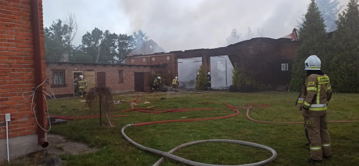 Jak dodaje działania straży pożarnej polegały na: podaniu trzech prądów wody w natarciu na palący się budynek gospodarczy, podaniu dwóch prądów wody w natarciu na palące się przedmioty w budynku mieszkalnym, przeszukaniu pomieszczeń w obu budynkach. Nie znaleziono osób poszkodowanych.
