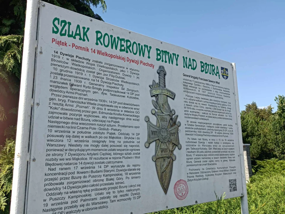 Docierając do piątku, warto również zatrzymać się w mieście, aby obejrzeć pomnik 14 Wielkopolskiej Dywizji Piechoty Armii „Poznań”, dowodzonej przez generała dywizji Tadeusza Kutrzebe. To on rozkazał swojej dywizji kontrnatarcie na szybko posuwające się w głąb kraju siły niemieckie. Dzięki staraniom polskich żołnierzy natarcie Niemców zostało wstrzymane, dając czas na umocnienie pozycji wokół Warszawy. Cała trasa jest dość łagodna, dzięki czemu bez obaw mogą w niej uczestniczyć najmłodsi fani rowerowych wycieczek.